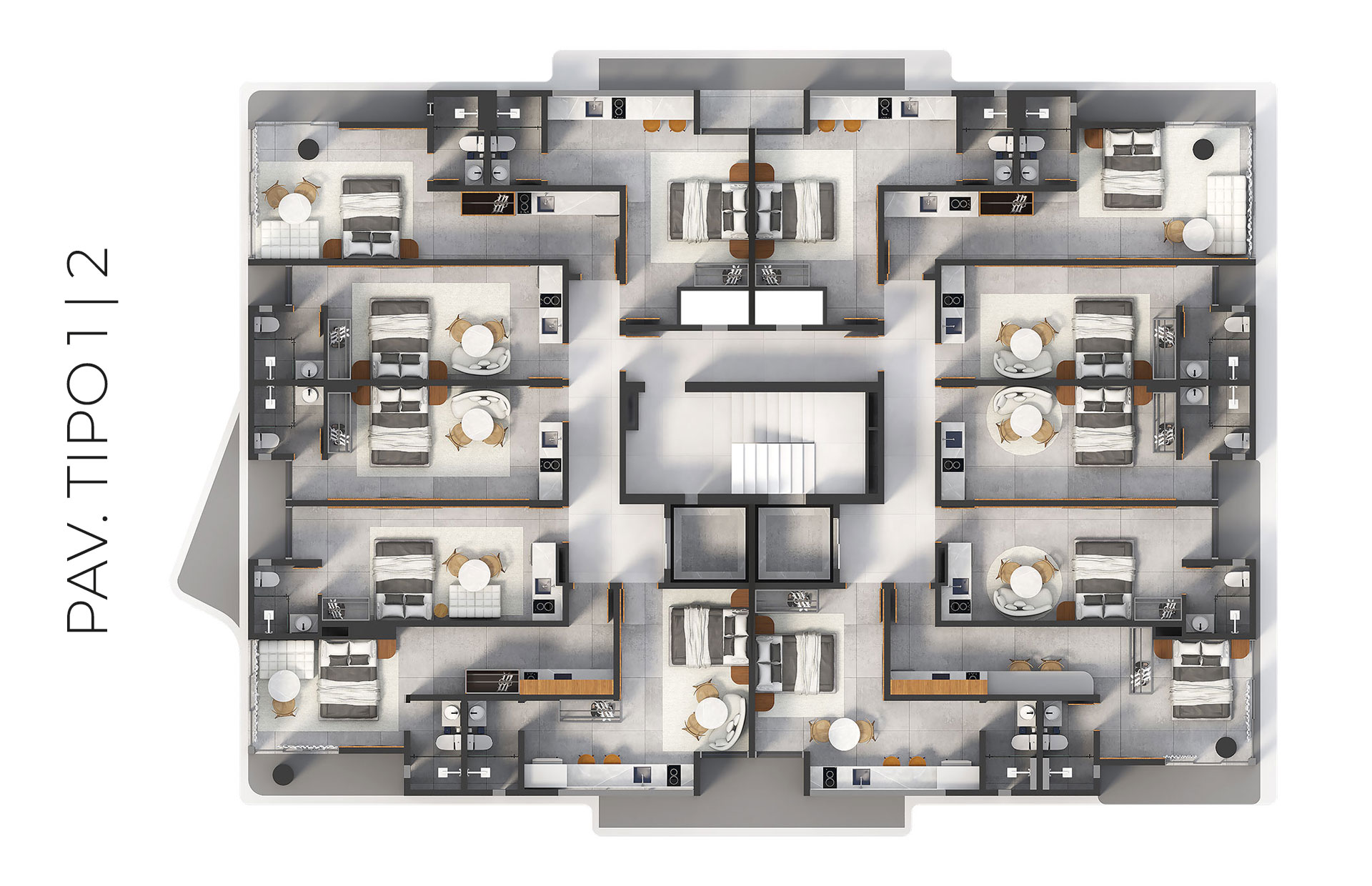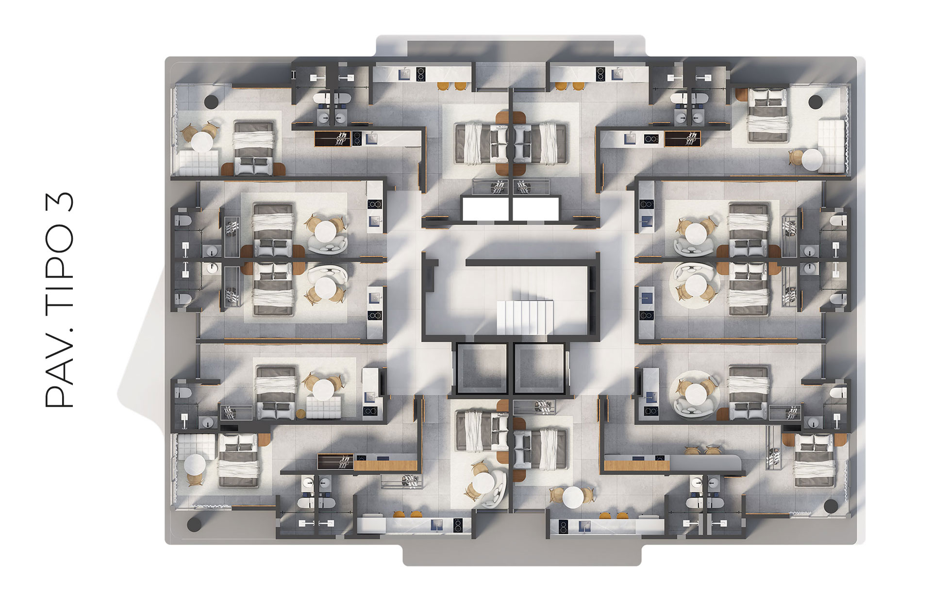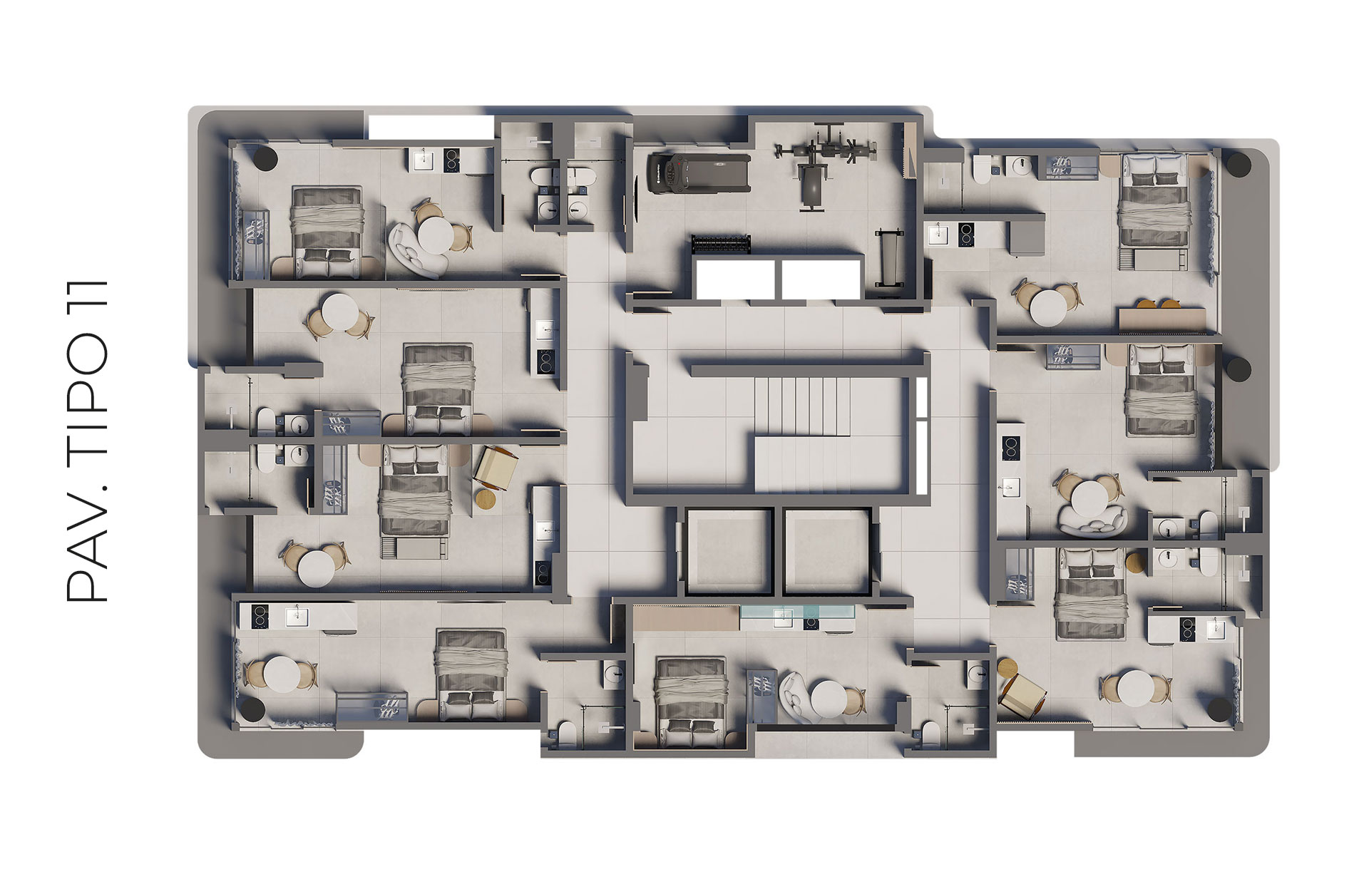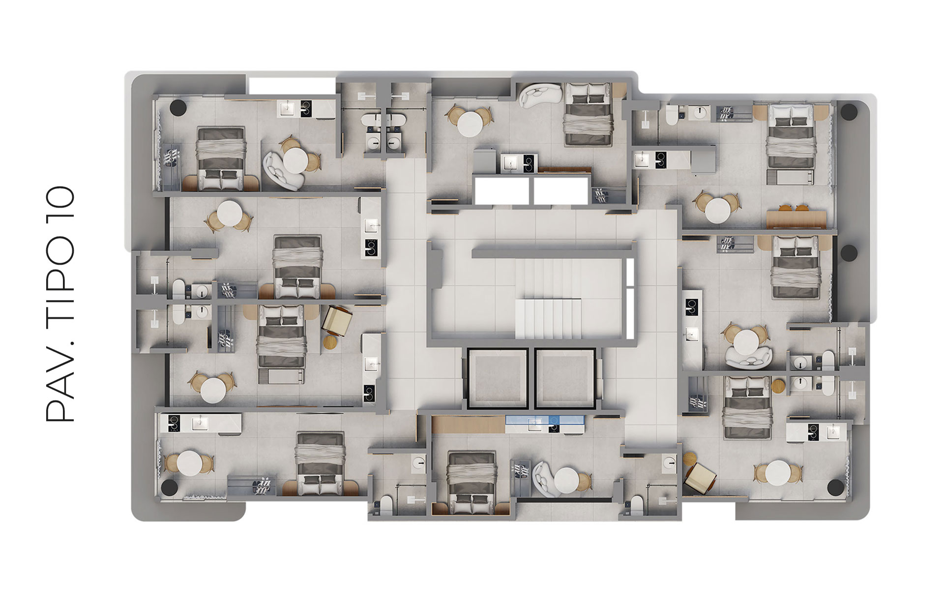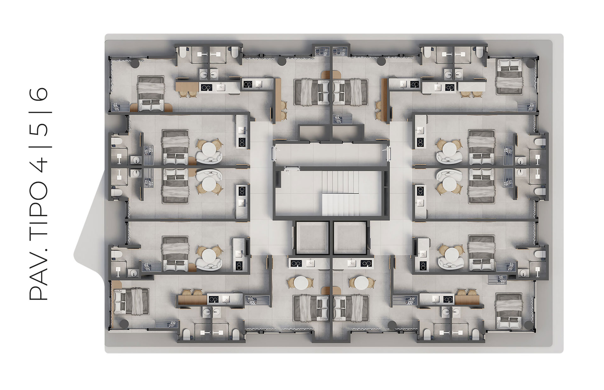 Os apartamentos foram projetados para acomodar de 4 a 6 hóspedes, perfil mais comum das visitas à cidade, família e grupos de amigos, garantindo maior ocupação e rentabilidade.